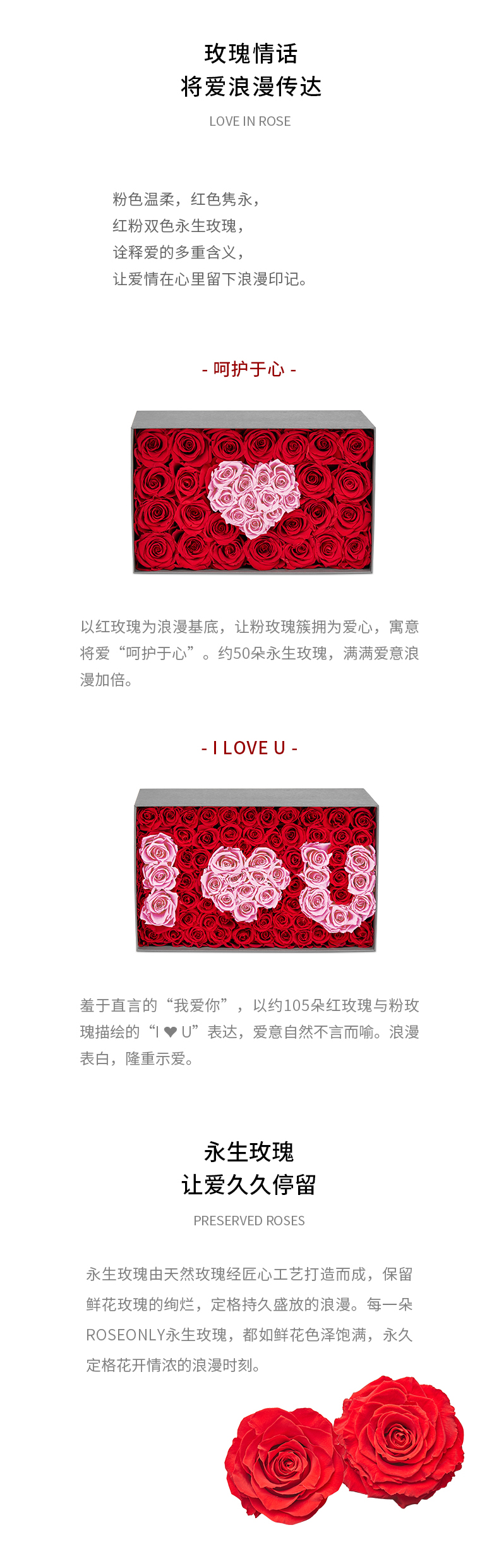 说明:永生玫瑰产品在自然因素影响下,会有些许变色,属于正常现象
