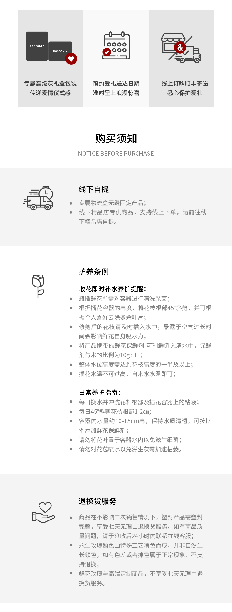 鲜花玫瑰与高端定制商品,不享受七天无理由退换货服务。