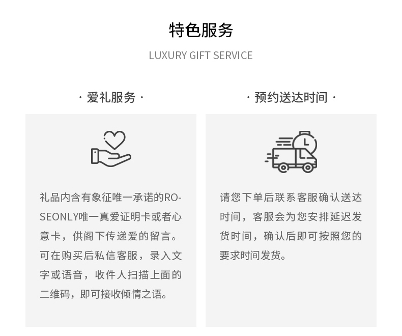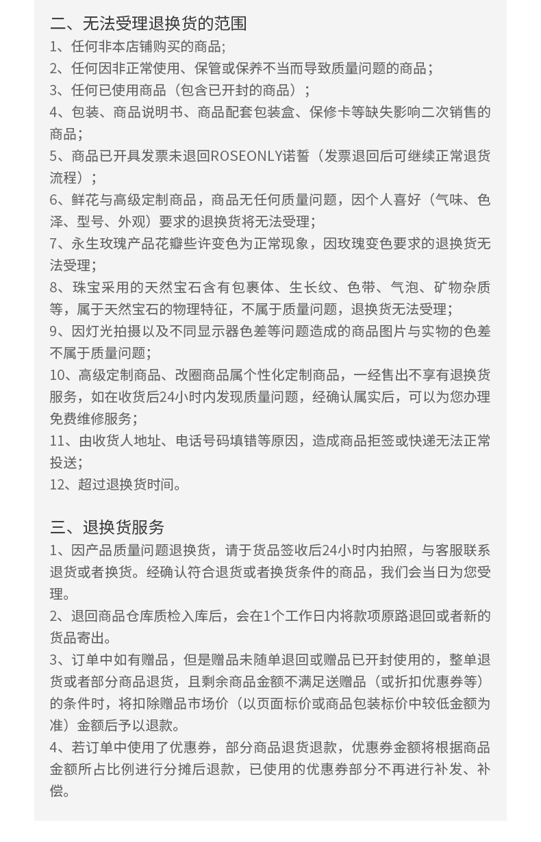 鲜花玫瑰与高端定制商品,不享受七天无理由退换货服务。
