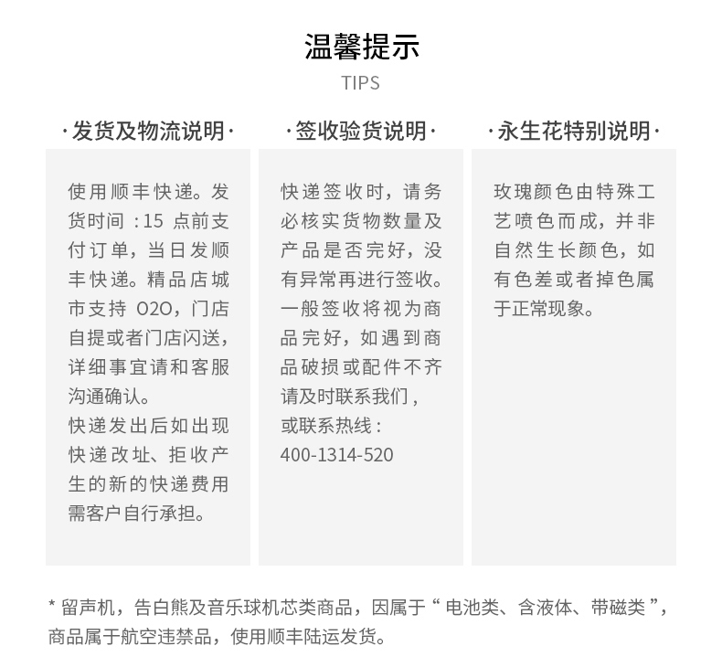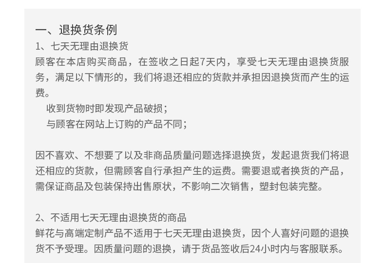 鲜花玫瑰与高端定制商品,不享受七天无理由退换货服务。