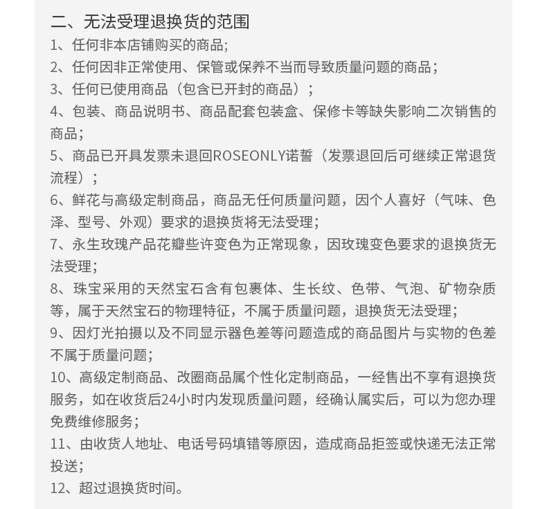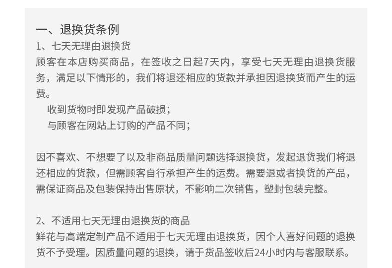 鲜花玫瑰与高端定制商品,不享受七天无理由退换货服务。