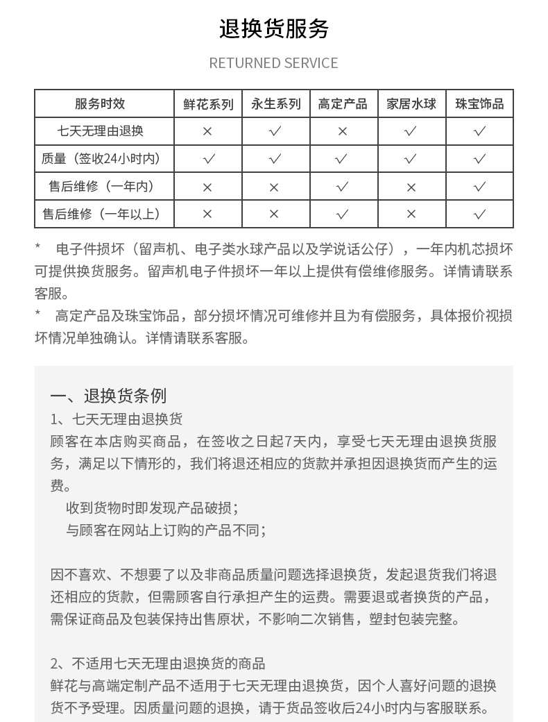 鲜花玫瑰与高端定制商品,不享受七天无理由退换货服务。