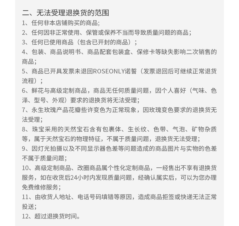 鲜花玫瑰与高端定制商品,不享受七天无理由退换货服务。