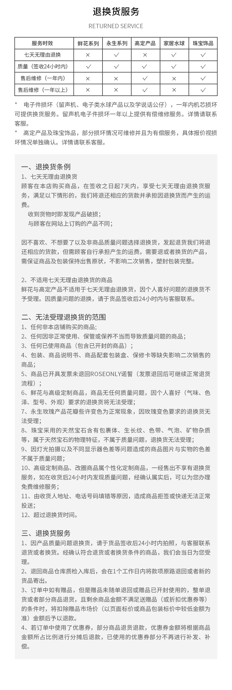 鲜花玫瑰与高端定制商品,不享受七天无理由退换货服务。