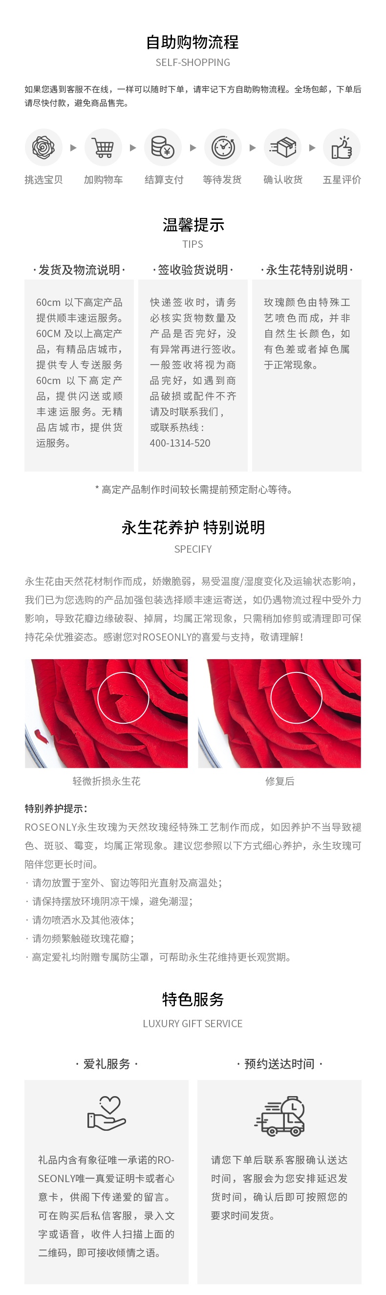 鲜花玫瑰与高端定制商品,不享受七天无理由退换货服务。